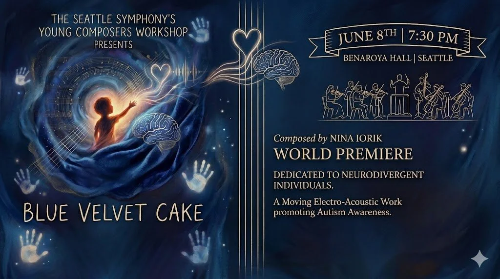 I am thrilled to announce the world premiere of my new work, "Blue Velvet Cake," taking place on June 8th at 7:30 PM at Benaroya Hall. This composition is more than just a musical piece; it is a dedicated tribute to neurodivergent individuals and a celebration of their unique strength.